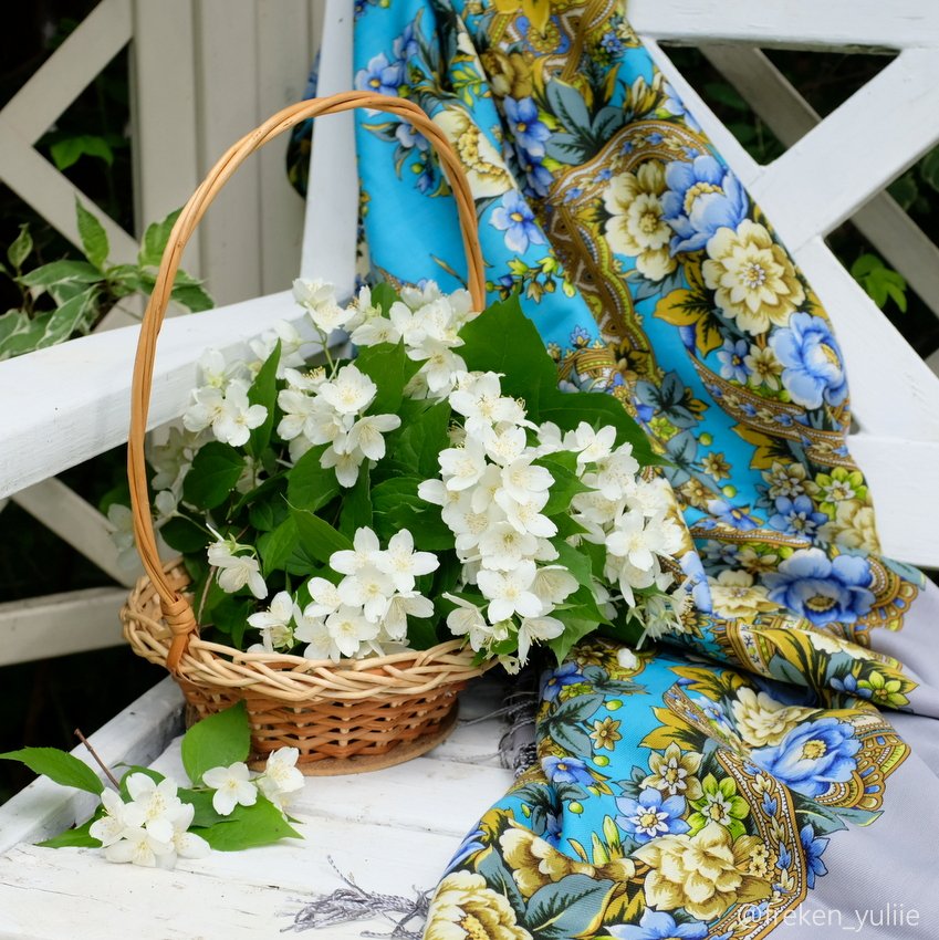Шаль Любимая Валерии Фадеевой для меня самая жасминовая шаль! Белые пенные цветы на кустах и яркое голубое небо.