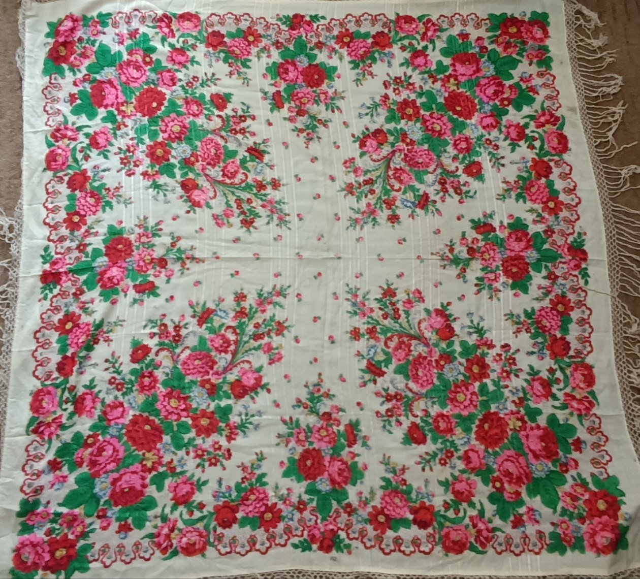 платочек-старинка, размер примерно 104×104, две противоположные стороны с одной подгибкой, другие без подгибки