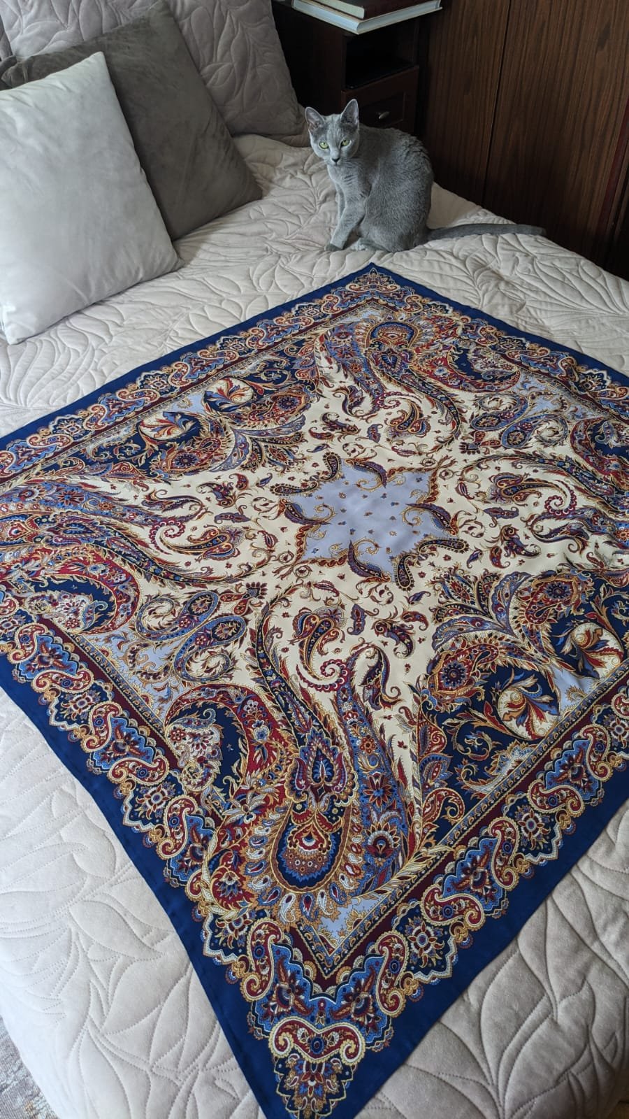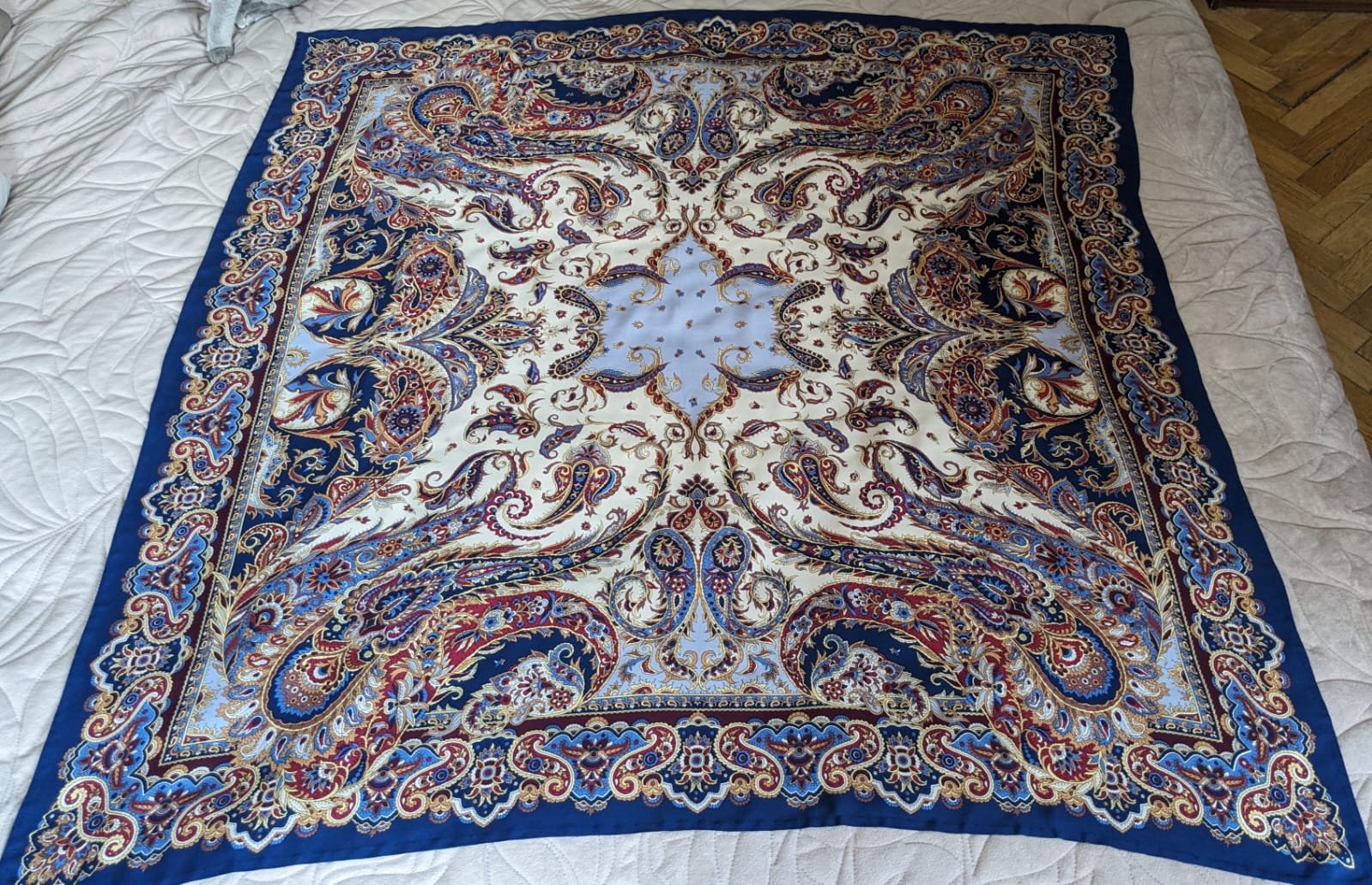 Восточные сладости с синей каймой и светлой серединой...шик! Задумалась о ней .Редко ношу большой шёлк, но такую шаль хочется иметь как драгоценность!