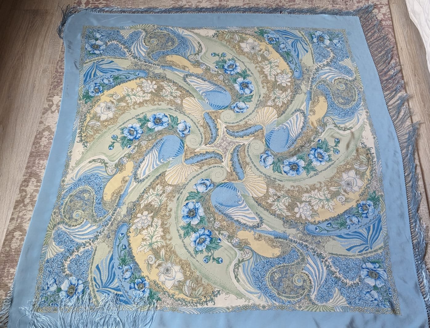 Было у меня с ней и потрясение. Как много раз не рассматривала картинки, не видела там зелёного цвета. А он там на четверть заполняет пространство, теперь уже я его вижу на тех фото, которые рассматривала. Обман зрения у меня был. Шаль очень красивая, влюбилась в нее. И зелёный флёр делает ее не похожей на другие голубые