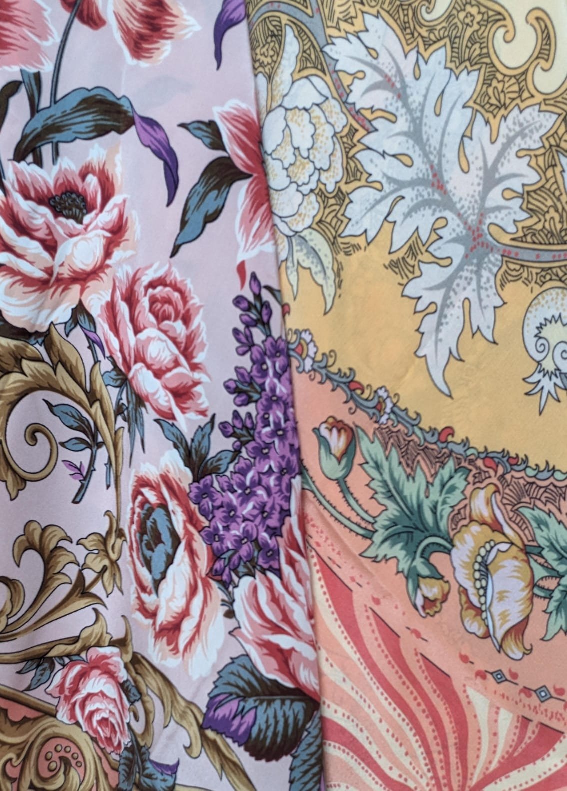 Давно лежал без дела крепдешиновый Коварство и любовь 5 колорит. Купила, так и не сняла этикетку, смущала меня кайма. Несколько лет назад фабрика перетряхнула склады и появились а, в, с вариации. По фото на сайте разница не особо заметна, а сравнить в магазине все забывала. На днях перетряхнула шелка и вспомнила, что надо бы поймать нужный вариант пока скидка.