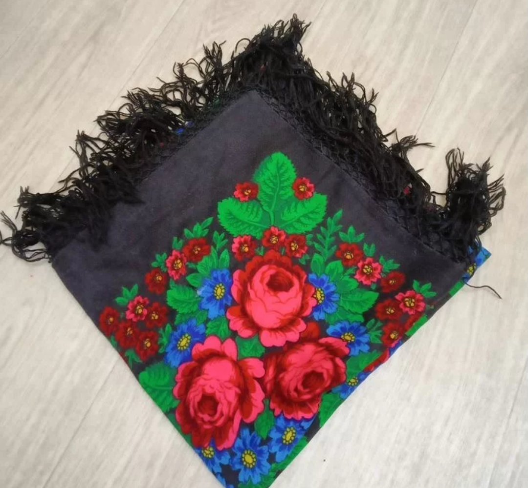 Добрый день! Помогите опознать ещё одну находку из секонда. Точно павловопосадский (в шве есть бирочка), 89х89 см без учёта бахромы. Ни на сайте, ни на форуме не нашла.