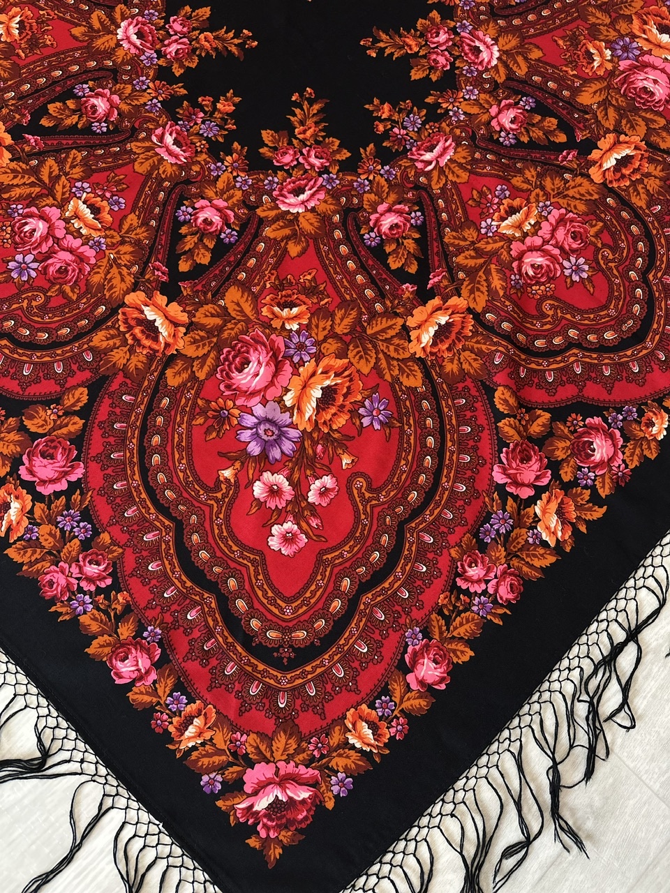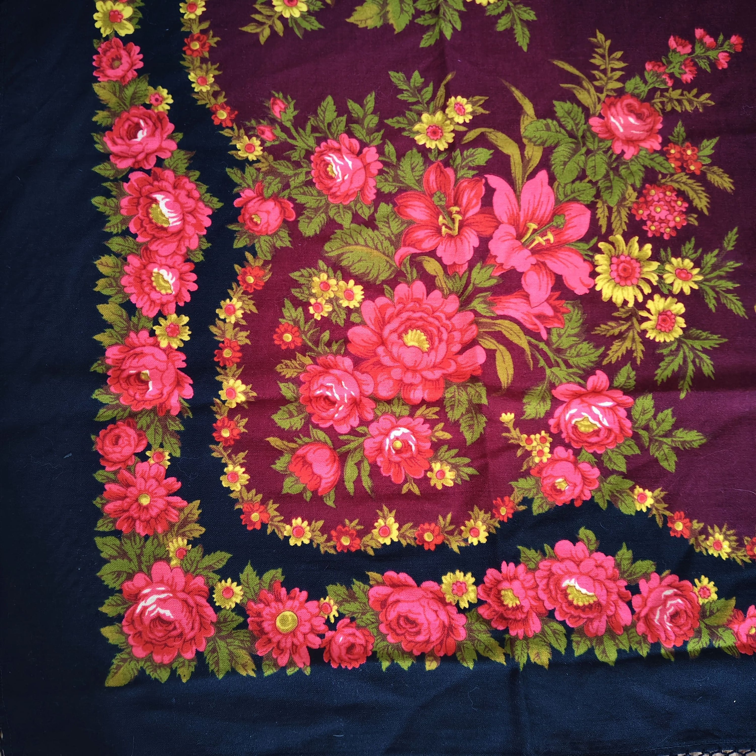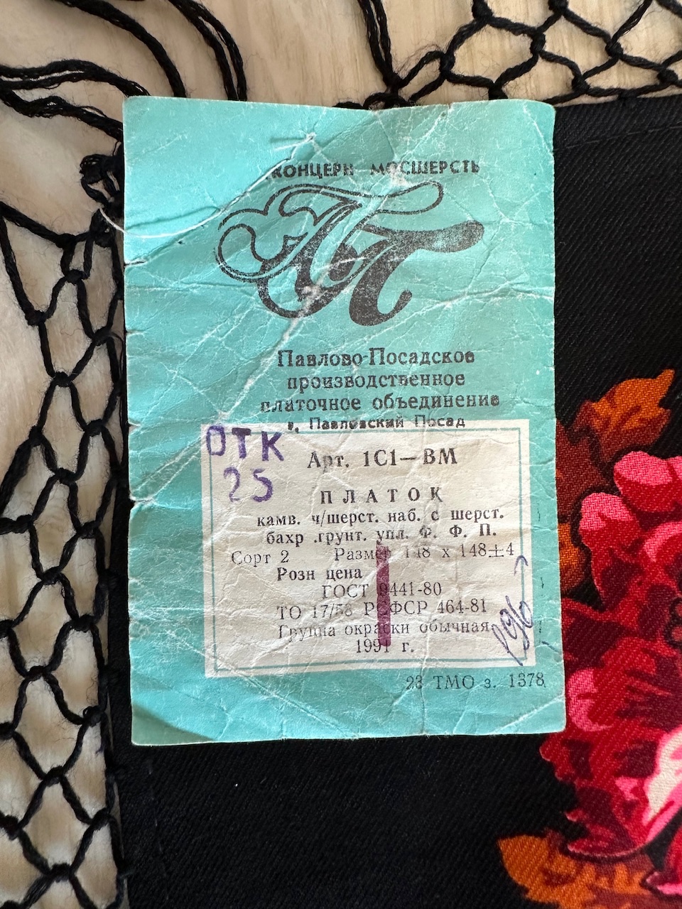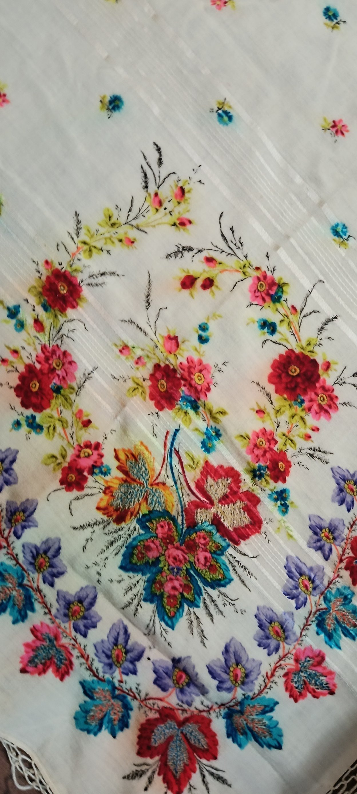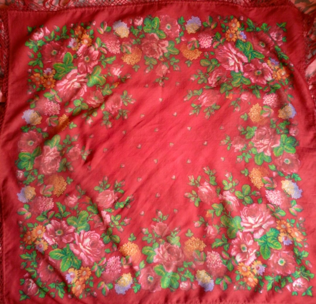 Появился в моей коллекции жаккардовый платок, в идеальнейшем состоянии, размер 108×108, с одной стороны одинарная подгибка, с другой без подгиба. Кто-нибудь может поделиться ссылкой на историю таких платков, каким годом датирован, может изестно?