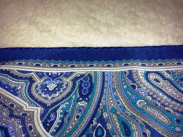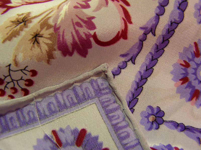Теперь дождёмся лицевой стороны её готового платка. Я начала обрабатывать макарониной шифоновый "Индийское лето", потому что на нём так же подшивка хромает - начинают высыпаться из-под строчки ниточки ткани. А ещё у меня впереди "Санкт-Петербург"... 8-)