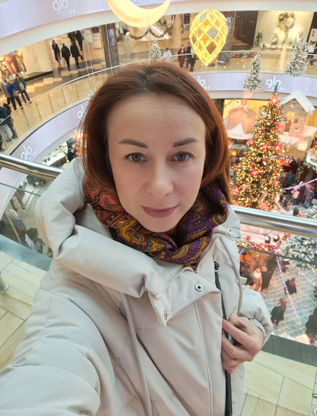 Очень люблю ваши показы! Шали всегда подобраны со вкусом и любовью, всегда вам к лицу! А уж как повязаны - это особое мастерство! Сегодняшние фото такие радостные, предновогодние, красочные, с настроением! Мариночка, Ожидание на вас смотрится отлично, очень хорошо сочетается со светлым пуховиком.