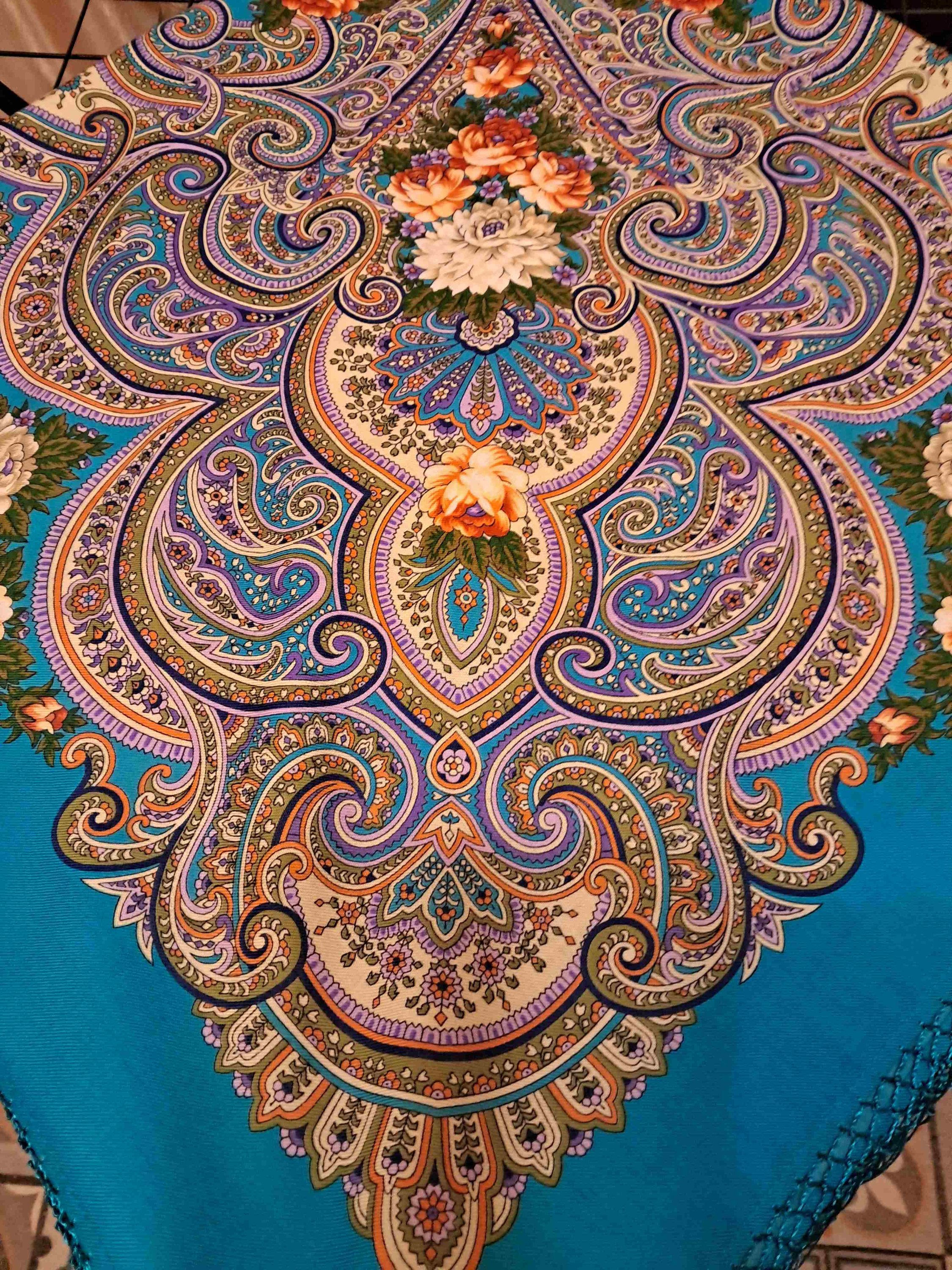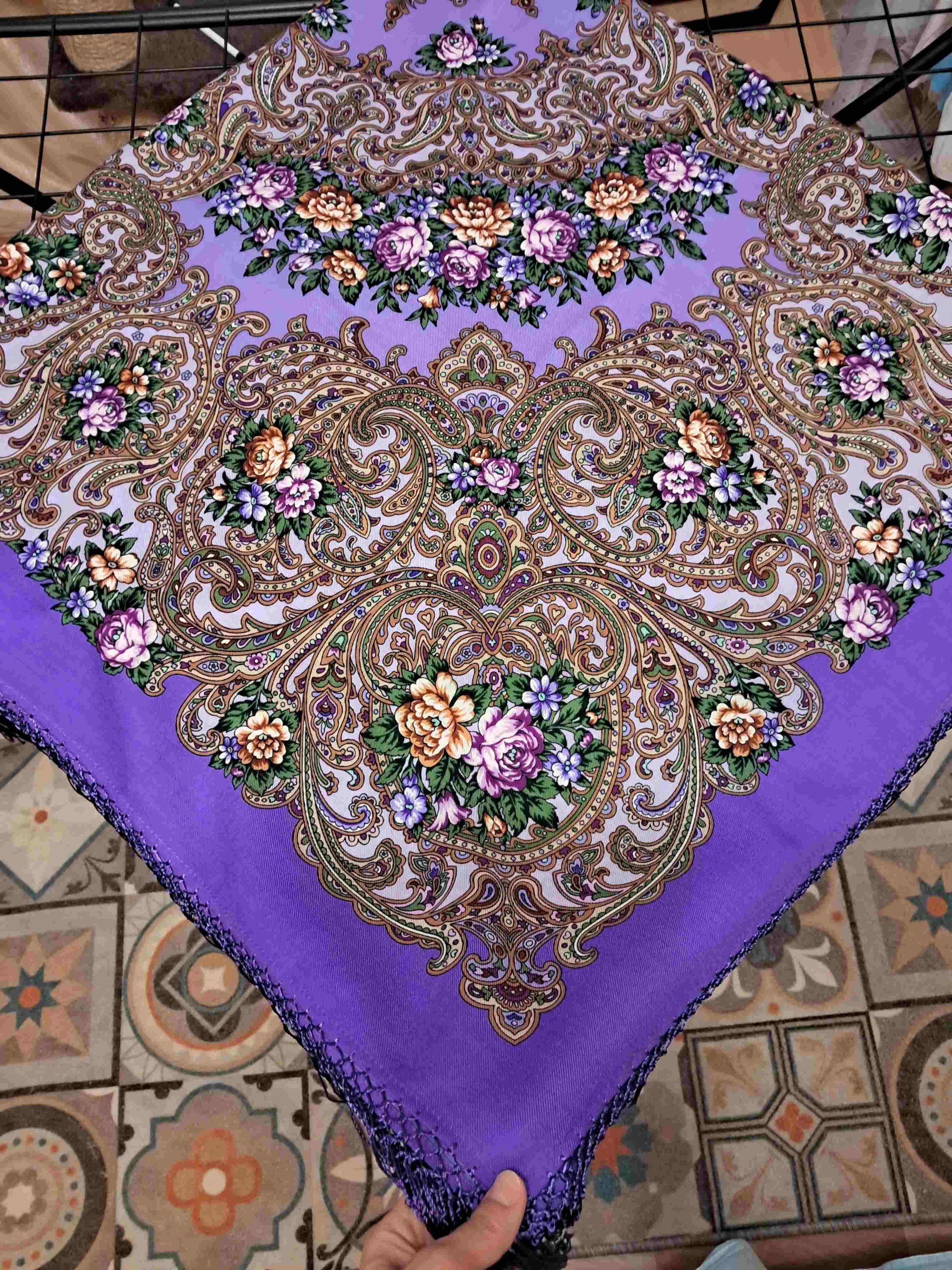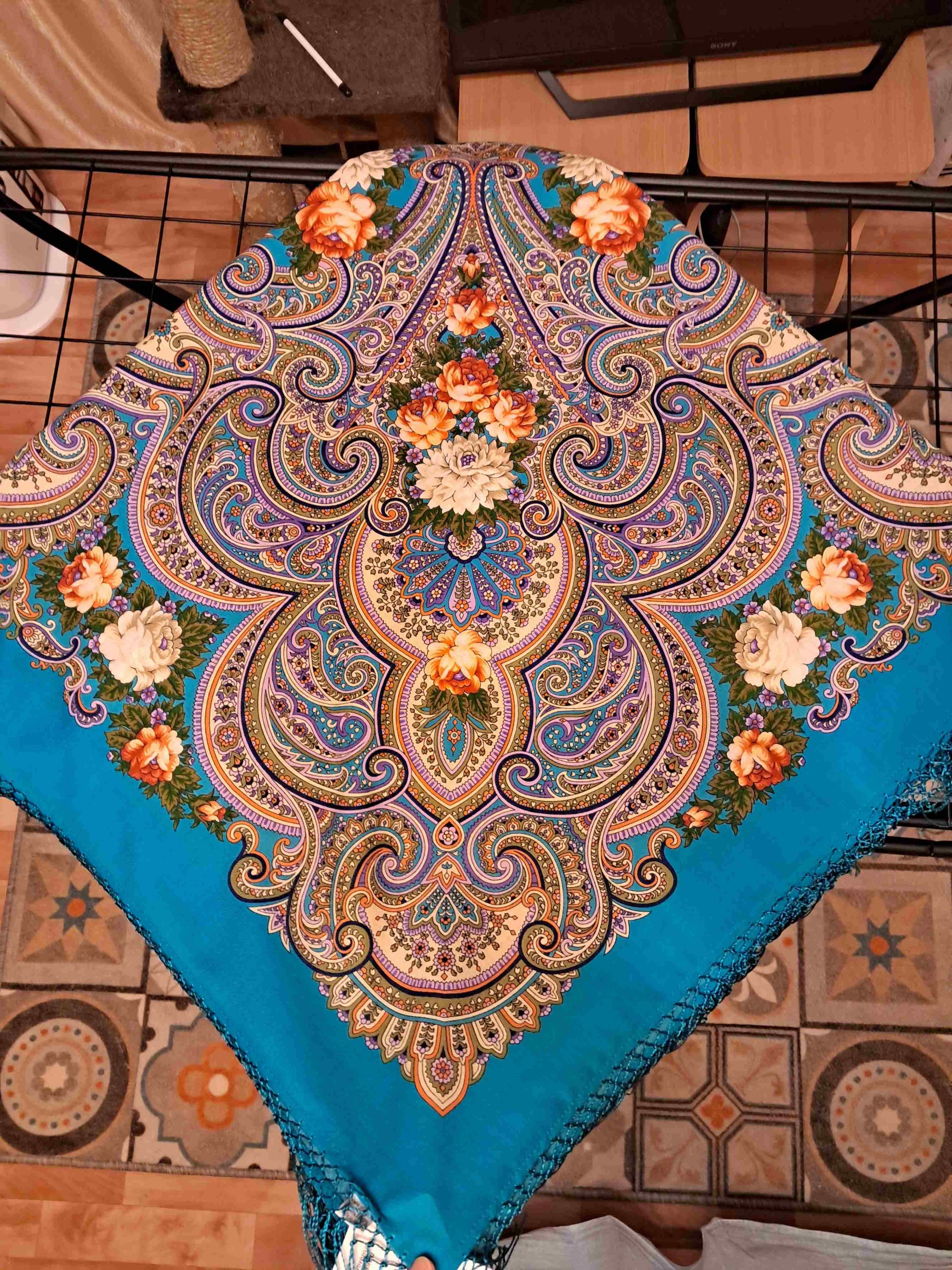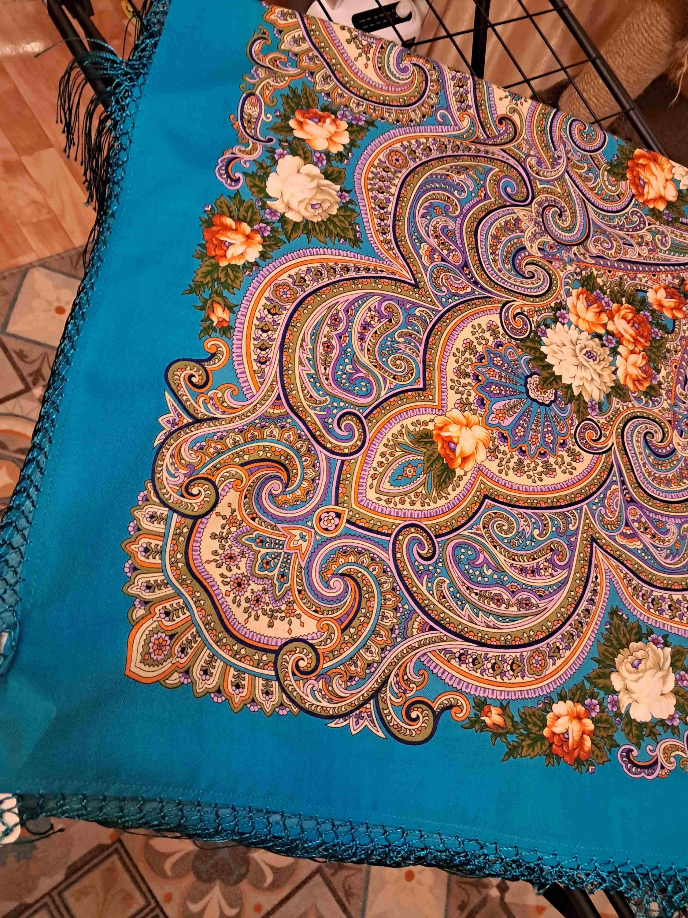 Платок красив: рисунок и колористика. Печать 2020 года. Мне не нравятся ткани на изделия конца 2020 и 2021 годов. Электризуются сильно нет этой шелковистости....так и тут бахрома бесперестанно липнет к платку.