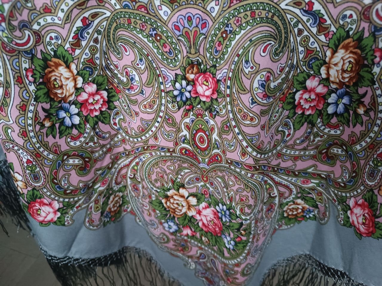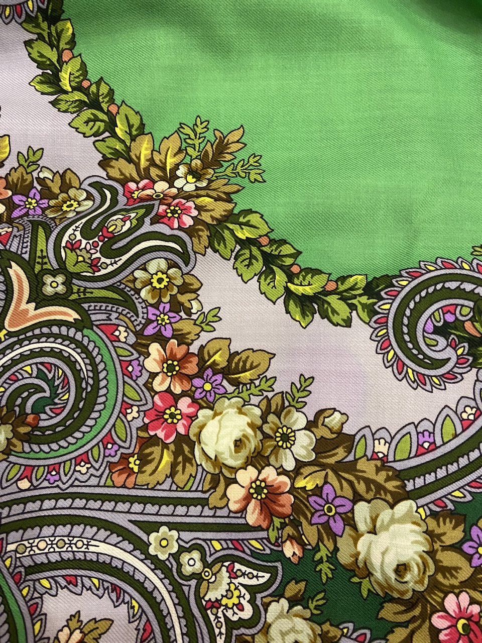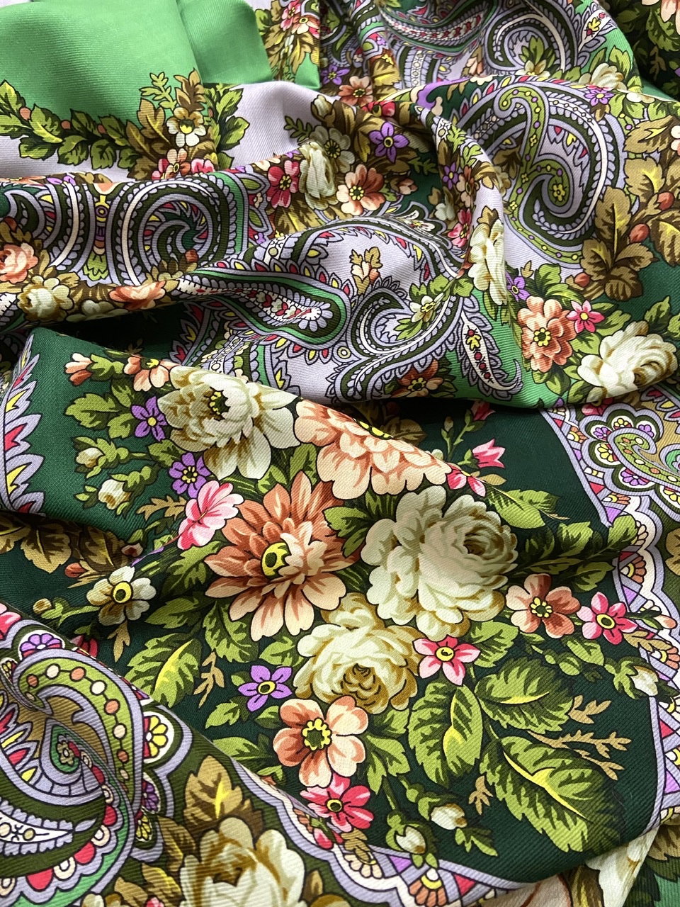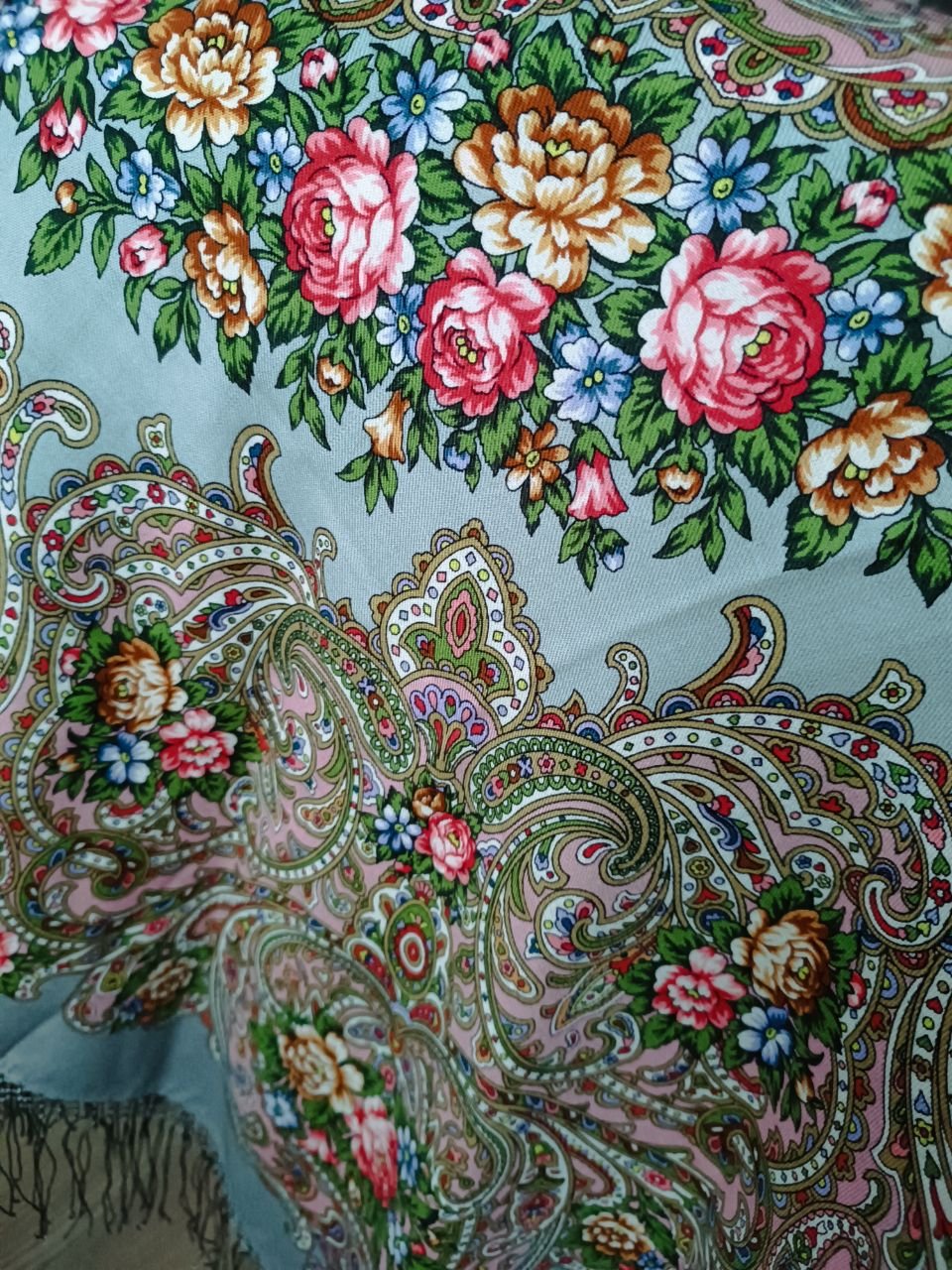 Платок красив: рисунок и колористика. Печать 2020 года. Мне не нравятся ткани на изделия конца 2020 и 2021 годов. Электризуются сильно нет этой шелковистости....так и тут бахрома бесперестанно липнет к платку.