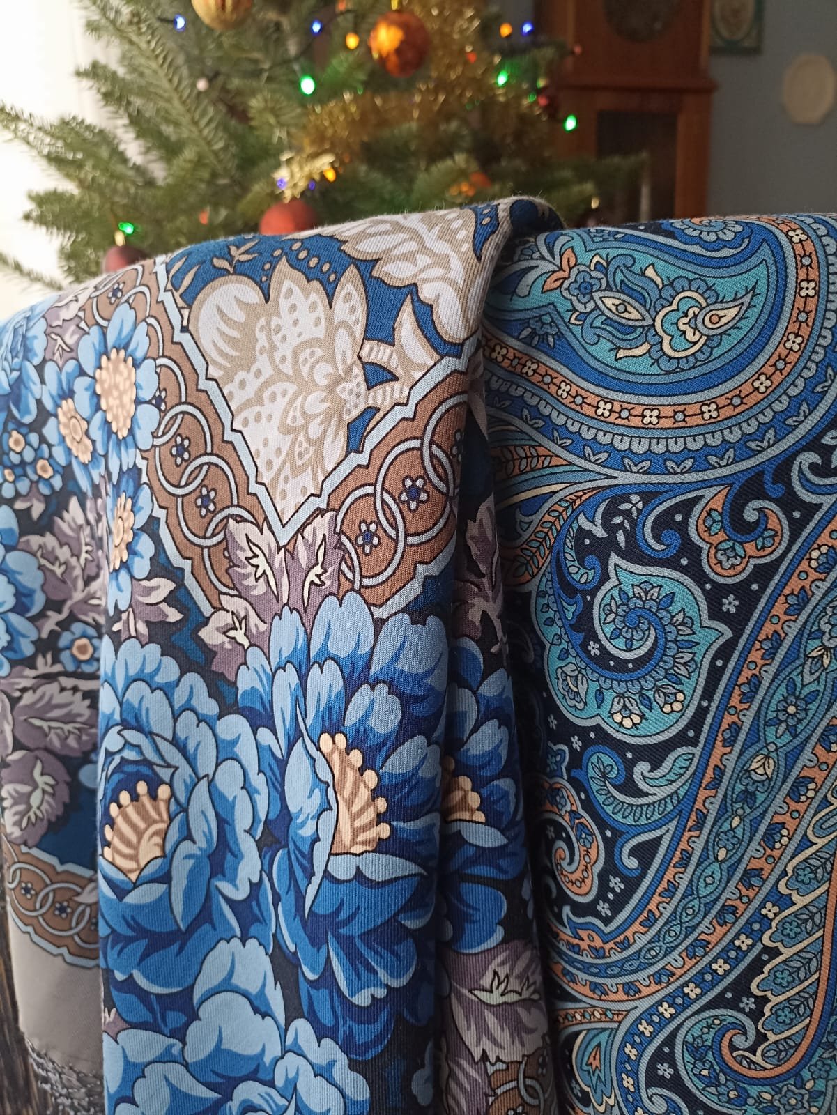 Наши с дочкой шали этого Рождества. Вот опять сюрприз, невероятную волну восторга у нее в школе вызвал этот Огненный танец. ну все подходили и слова говорили. Нет,он хороший, это точно. Но она такие шали надевает часто -на наш вкус неизмеримо более выразительные - и особого восторга они не вызывают. Разве что синяя Ненаглядная еще реакцию получает. Но вполне умеренную. А этот Танец прям фурор произвел. Никогда не угадаешь)