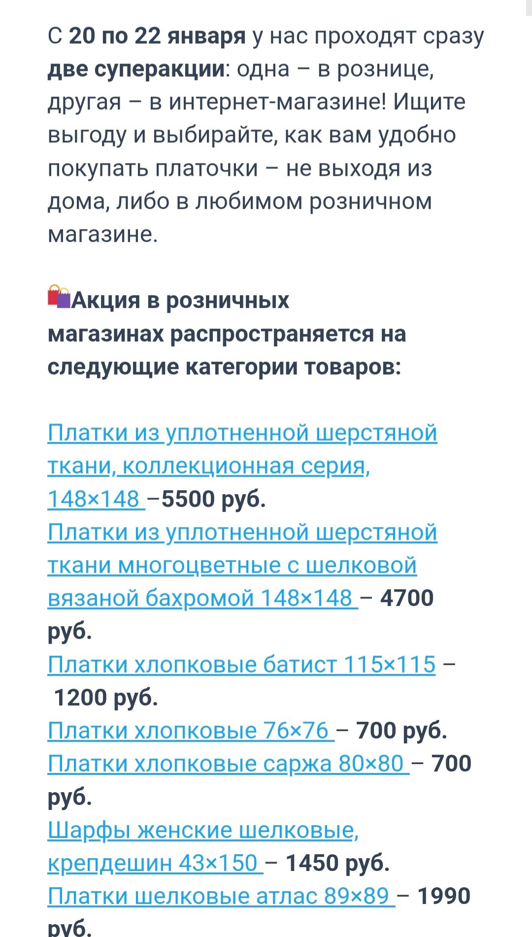 В связи с оптимизацией каналов продаж Павловопосадской платочной мануфактуры информируем вас об изменении ценовой политики.