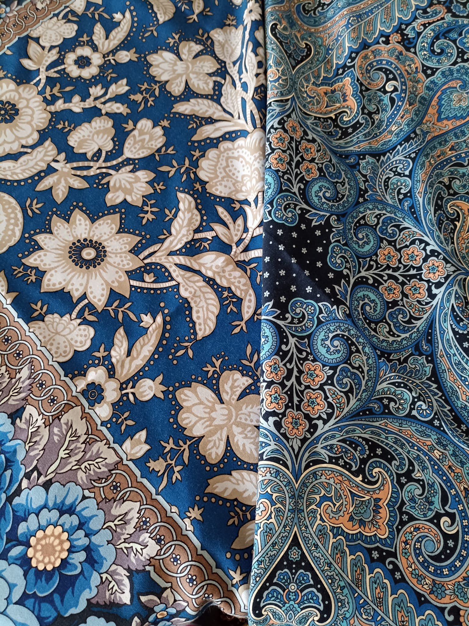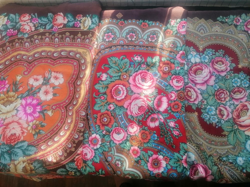 Купила для платочной подруги Посадский 7 и сравнила со своими Лето в Павлове 16 и Финифть 16. Сначала при электрическом свете. Финифть добавила к сравнению из-за цвета листвы , ну и просто по похожему настроению.