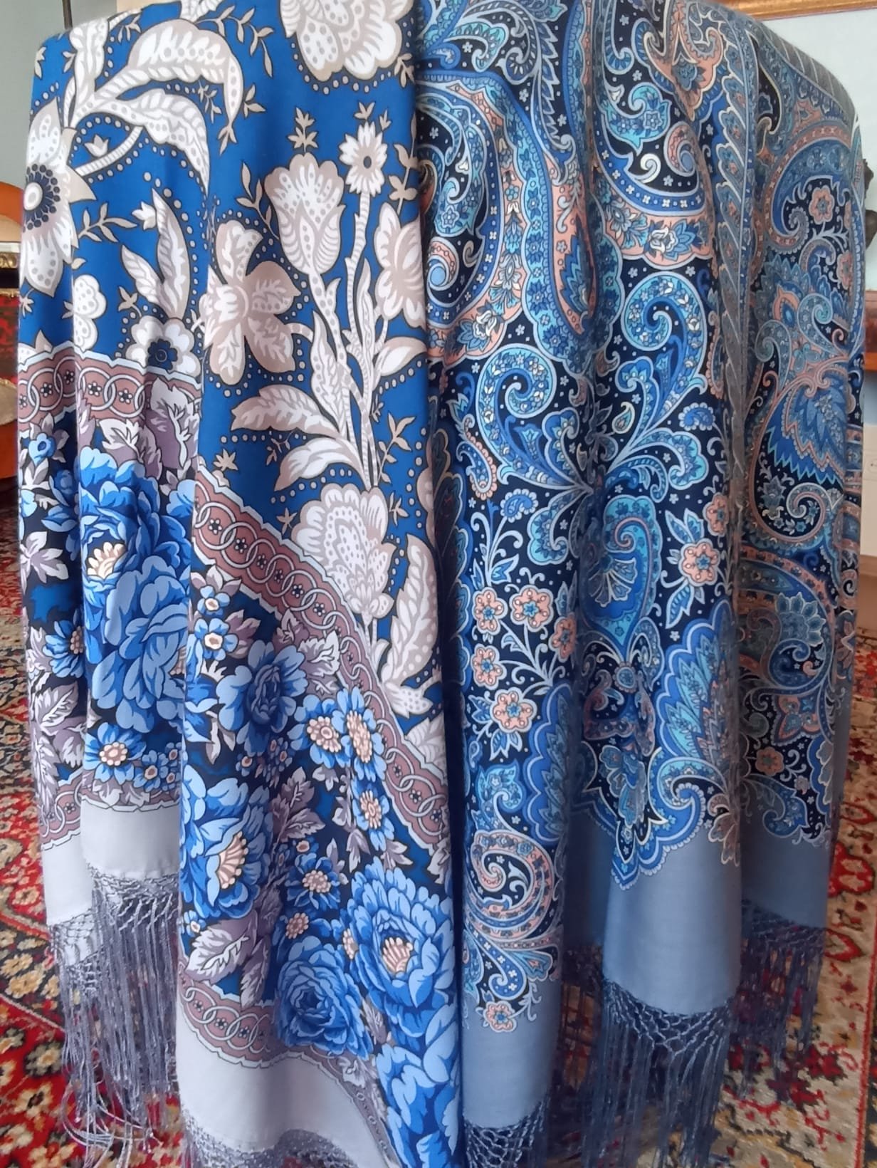Из моих трех колоритов "Зрелого возраста" самый тонкий серо-голубой. "Огненный танец" плотнее и жестче. Решила добавить для наглядности сравнительное фото шалей на голове при одном освещении. Даже фрагменты дают представление о разнице.