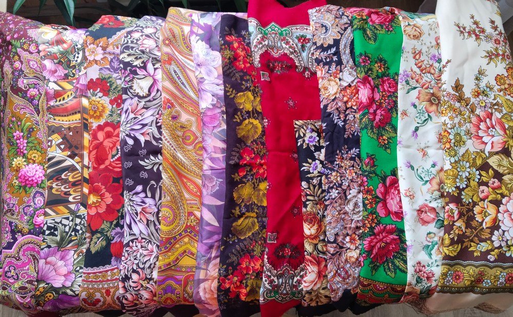 Слева направо: Миндаль, Волшебный мир, Времена года.Осень, После дождя, Ожидание, Цветочный ветер (Сафоновой рисунок на вискозе 130 см, название проверять лениво), Завалинка, Загадка, Южанка, Цветочные кружева? (Белокур вискоза 130 см, вроде такое название, запутаешься в этих цветочных именах, чтоб им), Чардаш, Россияночка и Возьмемся за руки, друзья!
