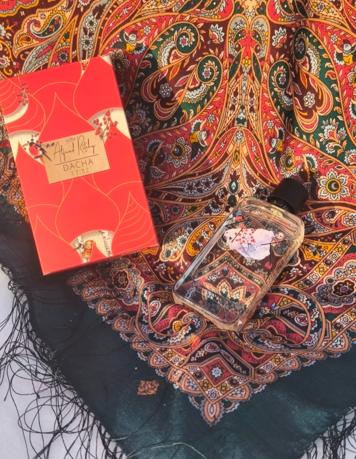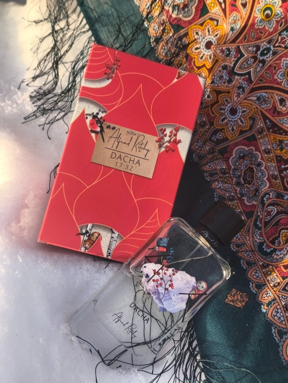 Для меня пахнет он не " Дачей", а именно тем, что нарисовано и на упаковке и на флаконе - хрустальной зимой, снегирями, матрёшкой с берёзами и...Павловопосадским платком