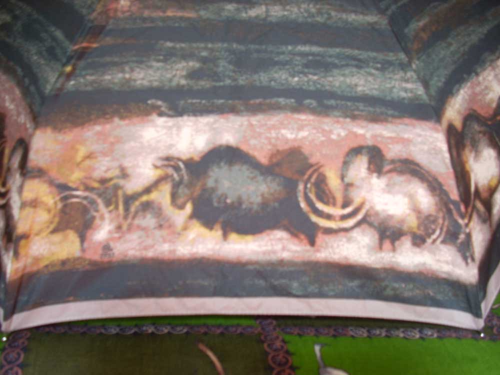 У кого с чем зонтик, а у меня с мамонтами :shock: . Отправилась покупать его, когда надоело таскать тяжеленную "дамскую сумочку"- после выкладывания зонта она легчала кило на три. В супермаркете перевесила в руке с сотню зонтов- и нашла это "чудо"- легчайший, невесомейший. Так обрадовалась его весу, что всю его красу оценила только дома. Подруги смеялись, но , взяв в руки, оценили покупку. Это потом появилось их великое множество-легких, с разными расцветками