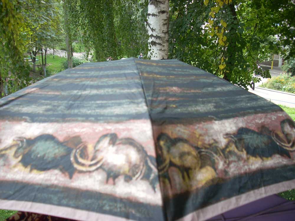 У кого с чем зонтик, а у меня с мамонтами :shock: . Отправилась покупать его, когда надоело таскать тяжеленную "дамскую сумочку"- после выкладывания зонта она легчала кило на три. В супермаркете перевесила в руке с сотню зонтов- и нашла это "чудо"- легчайший, невесомейший. Так обрадовалась его весу, что всю его красу оценила только дома. Подруги смеялись, но , взяв в руки, оценили покупку. Это потом появилось их великое множество-легких, с разными расцветками