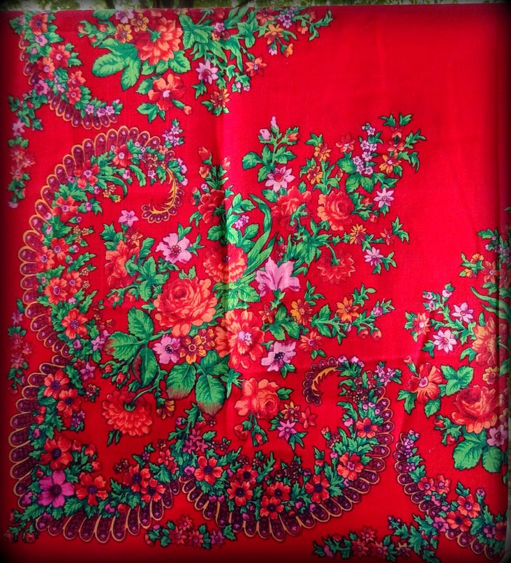 И ещё один платок. Размер около 1,46х1,46. Шерстяная бахрома в 3 ряда вязки. Мне кажется, что он конца 80-х - начала 90-х годов.Нашла его у бабушки в шкафу. В том, что это Павловский Посад сомневаться, мне кажется, не приходится) Тут есть такие знатоки платков, вот я и думаю - может, кто поможет опознать? Если не название, то, может быть, автора: