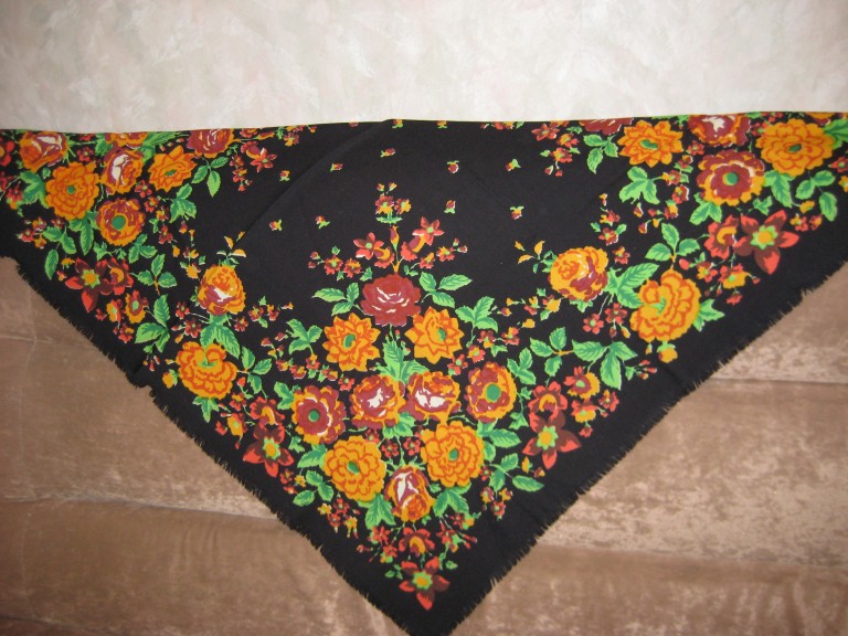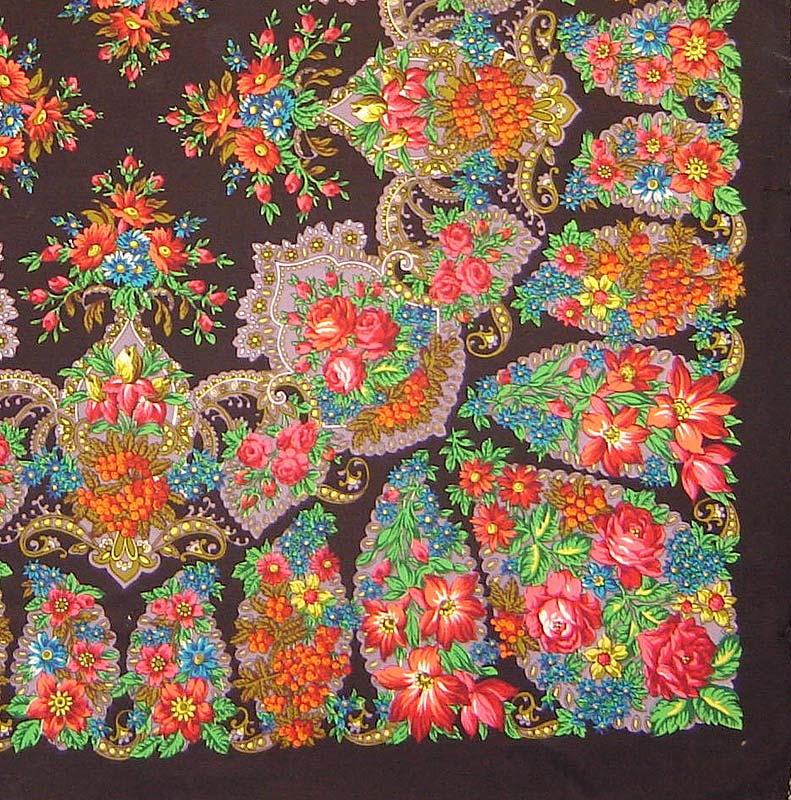 Iра81, очень интересный и красивый платок! Какого он размера? Очень понравилось (особенно это заметно на первой фотографии), что при всей традиционности расцветки платок хоть и выдержан в павловопосадском колорите (черный фон-розовые-красные цветы-зеленые листья), но нет крикливости, ядрености, схематичности в цветах. Очень светится роза на первой фотографии, почему-то при взгляде на Ваш платок в памяти всплывают жостовские подносы.