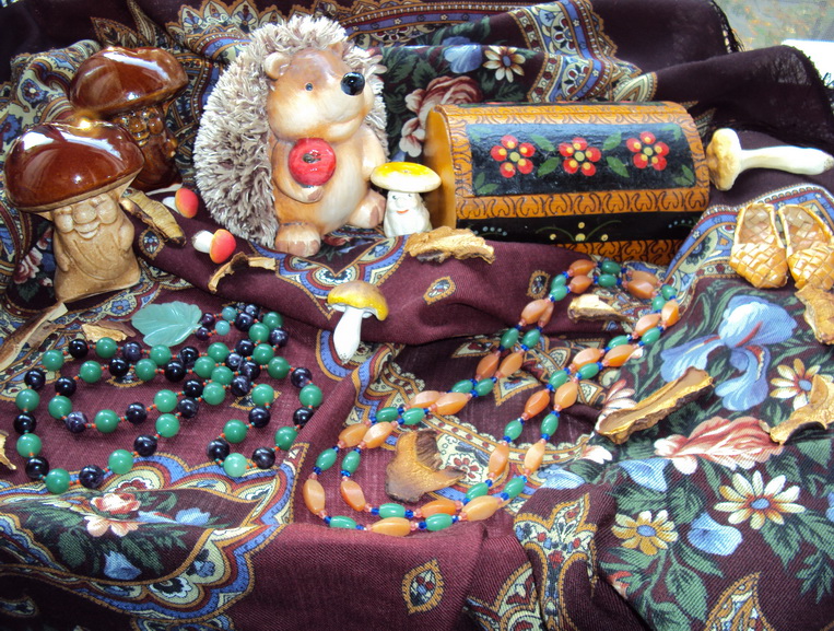 Что же касается старинного ларчика-полена, то в нём я уже много лет храню свои каменные браслетки. А также в нём умещаются ещё и "три сказочных богатыря". И хотя этот расписной ларчик открывается довольно просто, я его использую, как тест на со-о-образительность для гостей-новичков - только один, московский гость, его сразу открыл - а некоторые, в итоге, запрашивали "помощь зала"