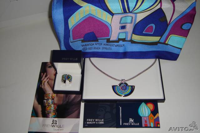 А колорит и манера рисунка Хундертвассера благополучно уведена дезигнером Фрей Вилле для коллекции эмалей. Только с указанием источника заимствования в названии - а говорят, для юристов это две большие разницы.