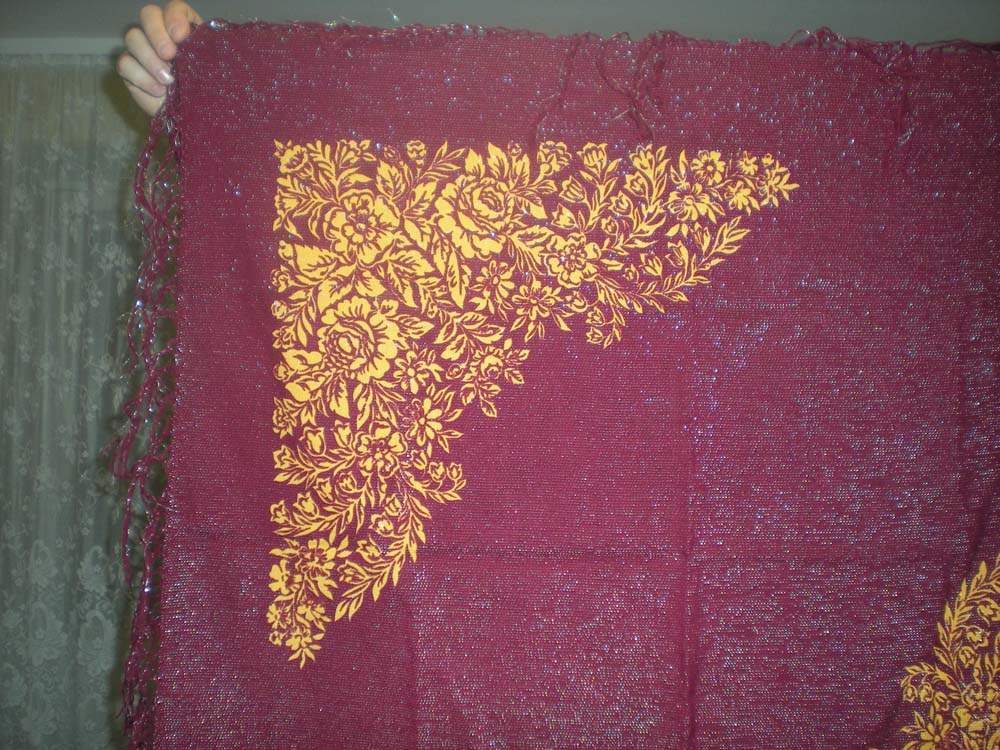 а у меня вот такой(в деревне у бабушки откопала, они в нем огород ходили полоть!!!!) нигде не нашла, изначально был с бахромой(шелковой вроде бы, но ее отрезали, поскольку половина скаталась, половина распустилась) размер 125*125