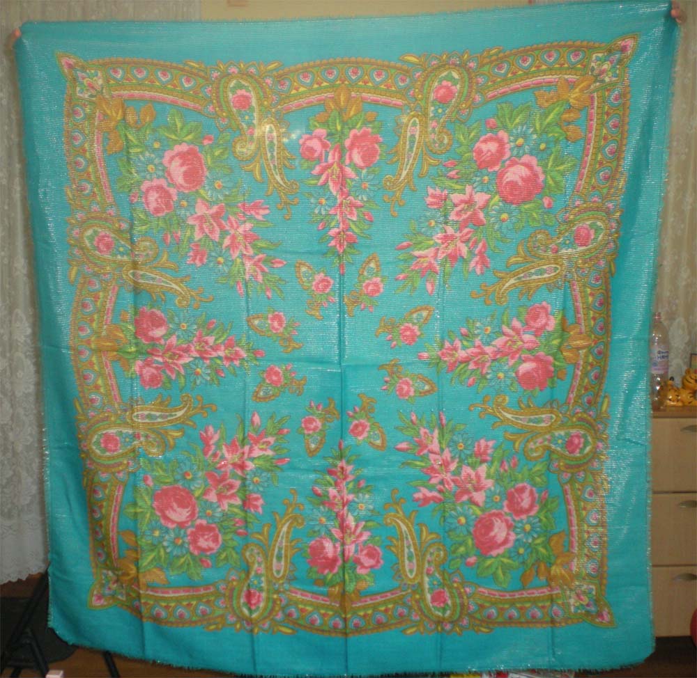 а у меня вот такой(в деревне у бабушки откопала, они в нем огород ходили полоть!!!!) нигде не нашла, изначально был с бахромой(шелковой вроде бы, но ее отрезали, поскольку половина скаталась, половина распустилась) размер 125*125