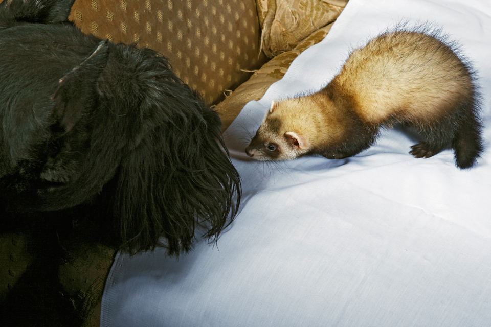 ... А собачка у Вас черный терьер,как он или она ладит с хорьком?