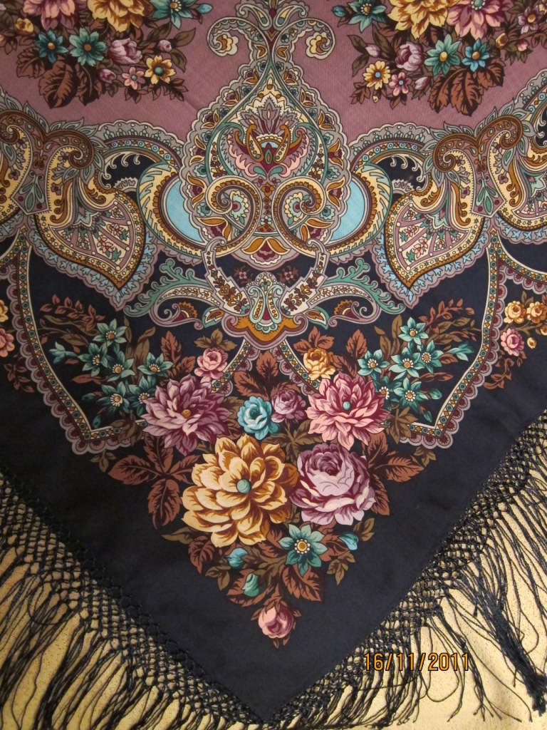 Мне очень нравится рисунок Русского сувенира, я все бью себя по рукам, чтоб не прикупить с темно-зеленым краем из ограниченной серии - но вот с чернопольным бы наверняка не удержалась. Роскошная шаль.