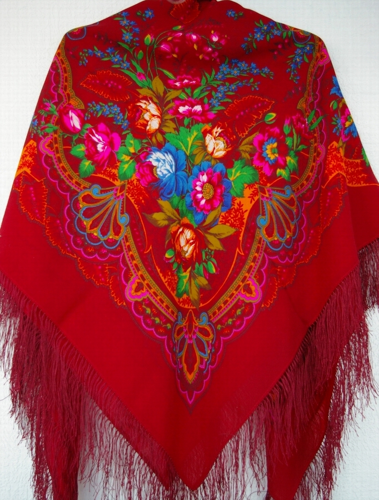 На фото, где платок висит, красный цвет фона и каймы более яркий, и, как бы "томатный". На самом деле красный цвет темнее и холоднее. На лежащем платке более соответствует действительности.