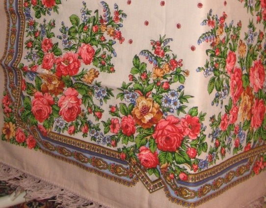 Смотрю на платок "Павловские розы" и видятся мне яблоневые сады Коломенского, узорная резьбы терема и Моква-река внизу течет голубой лентой Царствие Небесное Кларе Зиновьевой, вечная память ее мастерству...