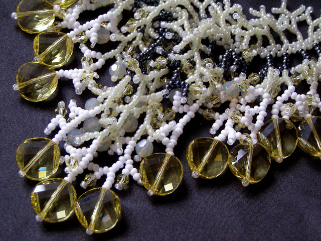 Назвала "Оттепель", так как представлялся чисто-белый снег, потом - тающий, потом - чернеющий... и капельки воды с солнечными бликами. Бисер чешский и стразы Сваровски.