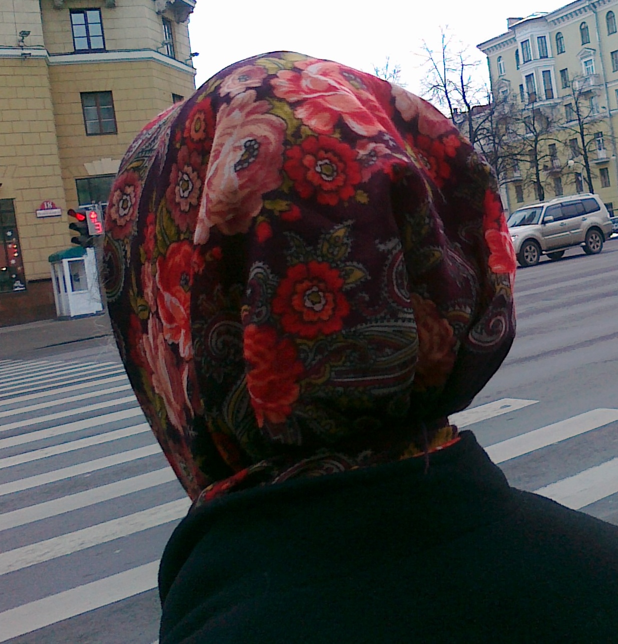 Захожу я тут в наш ГУМ и натыкаюсь на женщину лет 60-и вот в этом платке. Приближаюсь и на телефон её сзади - ж-ж-ж-ик! Она так оборачивается, мол откуда этот звук? Я смотрю - не получилось, надо ближе, бегом за ней, она ходит по отделам, а я у самого её уха опять ж-ж-ж-ик! ж-ж-ж-ик! Она как-то умудряется уворачиваться - получается полголовы. Кадров 5 сделала и всё ерунда. Затем я подумала о себе, призналась себе, что я сошла с ума, купила что надо и ушла из ГУМа. Перехожу на светофор через проспект, а она опять оказалась рядом. Ну тут со мной опять случился приступ фотографирования. Благо успела, пока не загорелся красный свет. Бедная женщина наверное подумала, что у неё со здоровьем что-то и в ушах постоянный звук ж-ж-ж-ик! ж-ж-ж-ик! А кто-нибудь скажет - как называется объект моей охоты? Может Молитва-7?