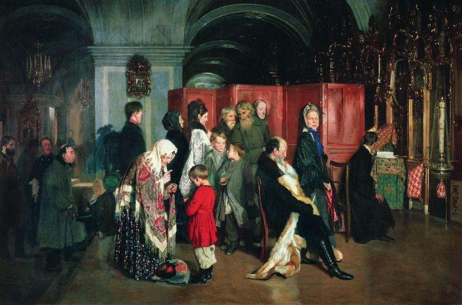 В Тверской галерее хранится первый вариант картины Корзухина "Перед исповедью".