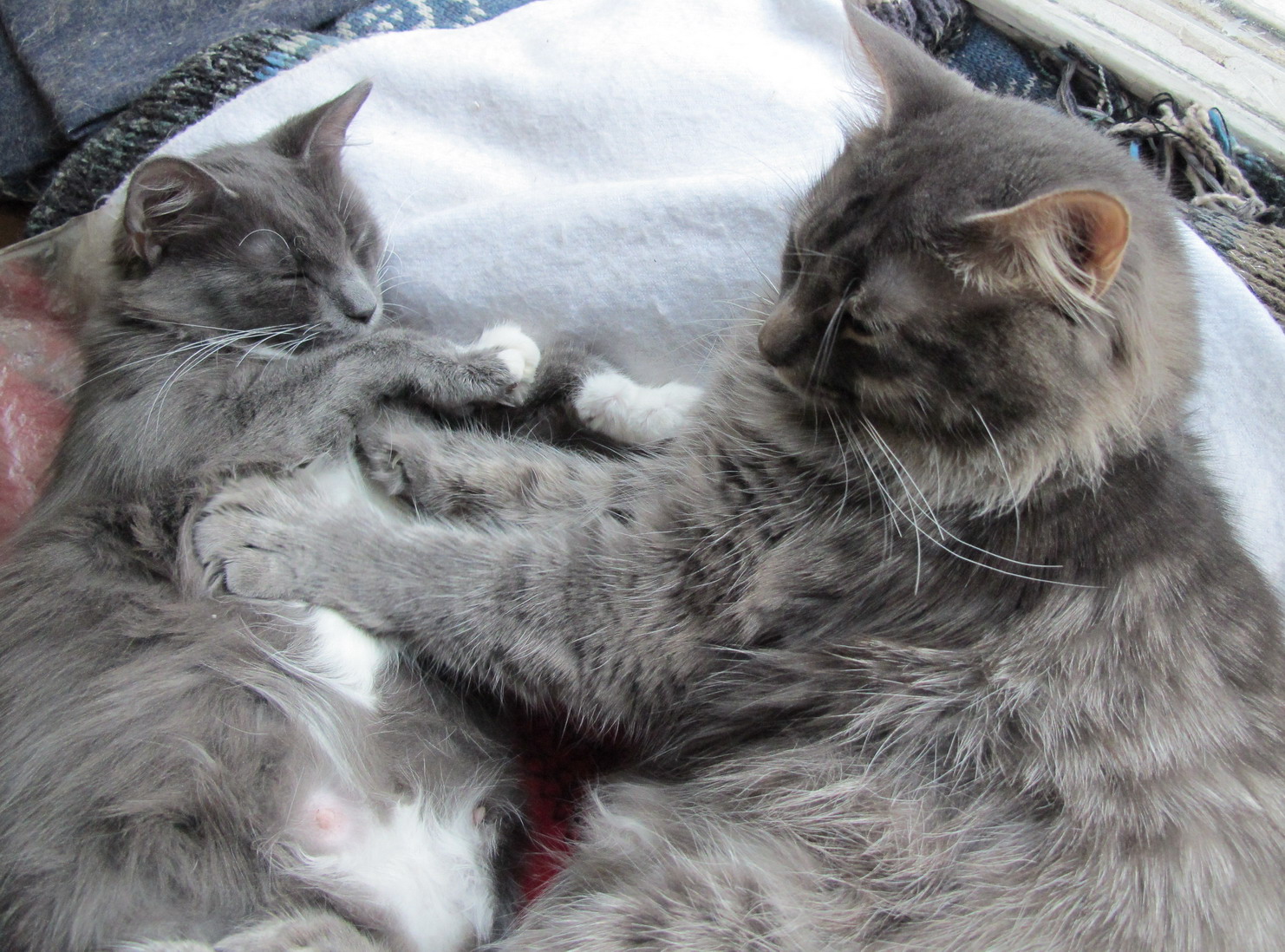 А вот мои, Ёся, младший кот, даже во сне имеет шкодливый вид, и сладкая парочка, Масик и Зюзя II, зюзины котята от него были.