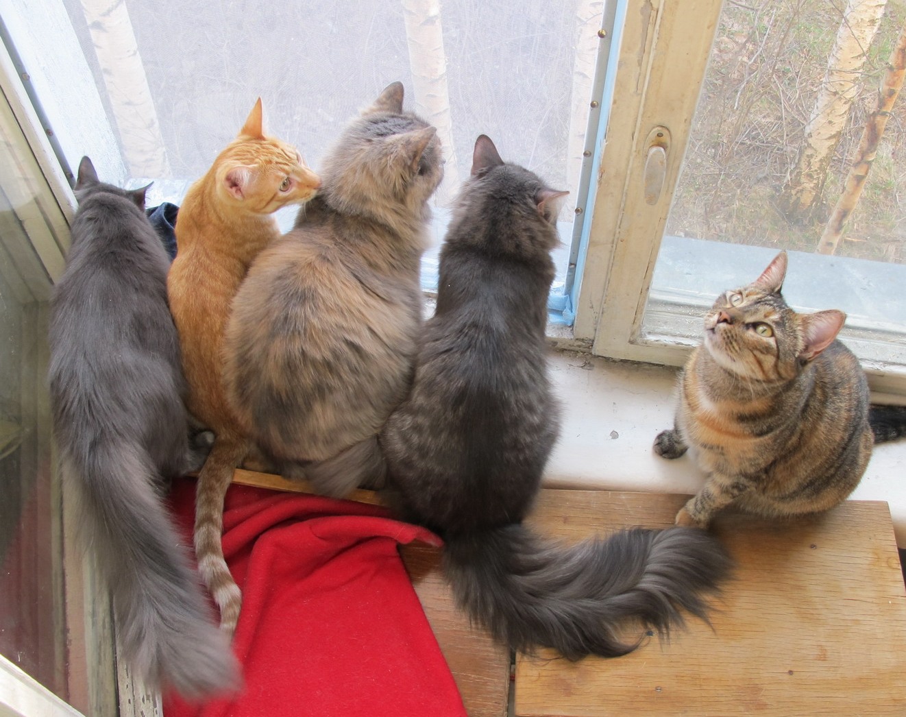 Разбирала свои альбомы, нашла фото с прошлой весны. Первое тепло, открытые окна, котостадо на охоте. В соседней комнате на лоджии мама всю зиму птиц кормит, весной они еще прилетают, если б не сетка на окнах, коты бы дружной стаей спикировали, не раздумвая.