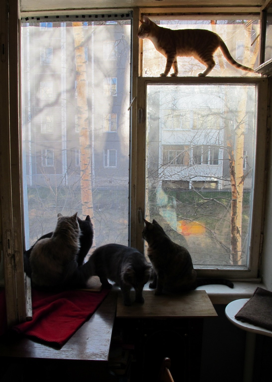 Разбирала свои альбомы, нашла фото с прошлой весны. Первое тепло, открытые окна, котостадо на охоте. В соседней комнате на лоджии мама всю зиму птиц кормит, весной они еще прилетают, если б не сетка на окнах, коты бы дружной стаей спикировали, не раздумвая.