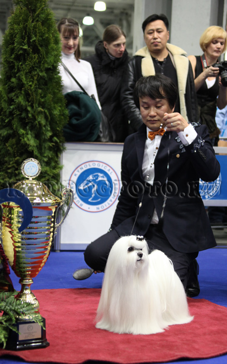 А это Победитель ЕВразии 2012 (второго дня) - мальтийская балонка. Из Японии. Хендлер тоже японец. Потрясающая собака и потрясающий показ в ринге. Настоящий Чемпион (а грумминг какой! Она аж светилась в ринге!)