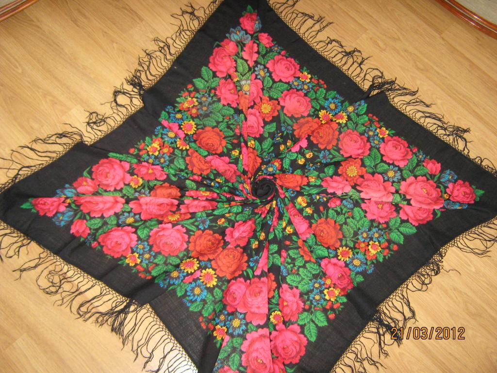 Аквамарин2501, платочек не павловопосадский. У него очень характерная бахрома - с такой как бы поперечной перевязкой. Кто сам делает бахрому, вернее скажет, как это вяжется и как называется. Платочки с такой бахромой не павловопосадские. А чьи именно, не знаю.