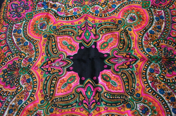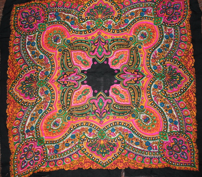 Здравствуйте! У меня есть вот такой платочек. Размер 84х84, возможно был больше, но после стирок подсел, оверложен. Старенький уже, лет 30 точно, а там уж не знаю (от бабушки достался). Помогите опознать