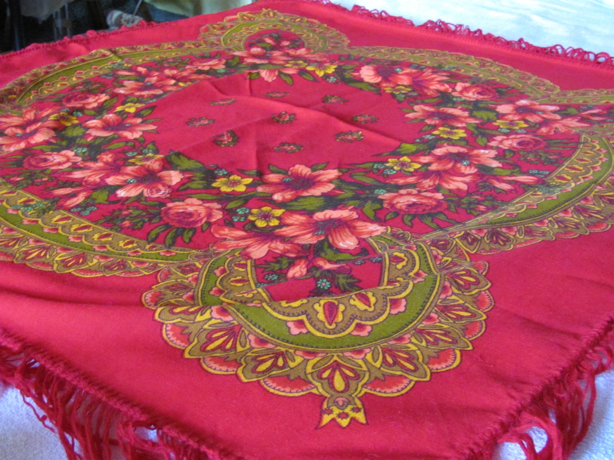 Девушки, а может кто знает как зовут мой платочек? Размер у него 89*89, приобретен был еще году в 1991-м, примерно. Ношу его, ношу, и только недавно в голову пришло узнать название))) Вот! Фото сдела в домашних условиях при естественном освещении (но, видимо, слабоватом, т.к. реально фон теплого темно-красного цвета, цветы ярко-розовые, холодные, аж ядовитые, а орнаментальная полоса рыже-коричневая)