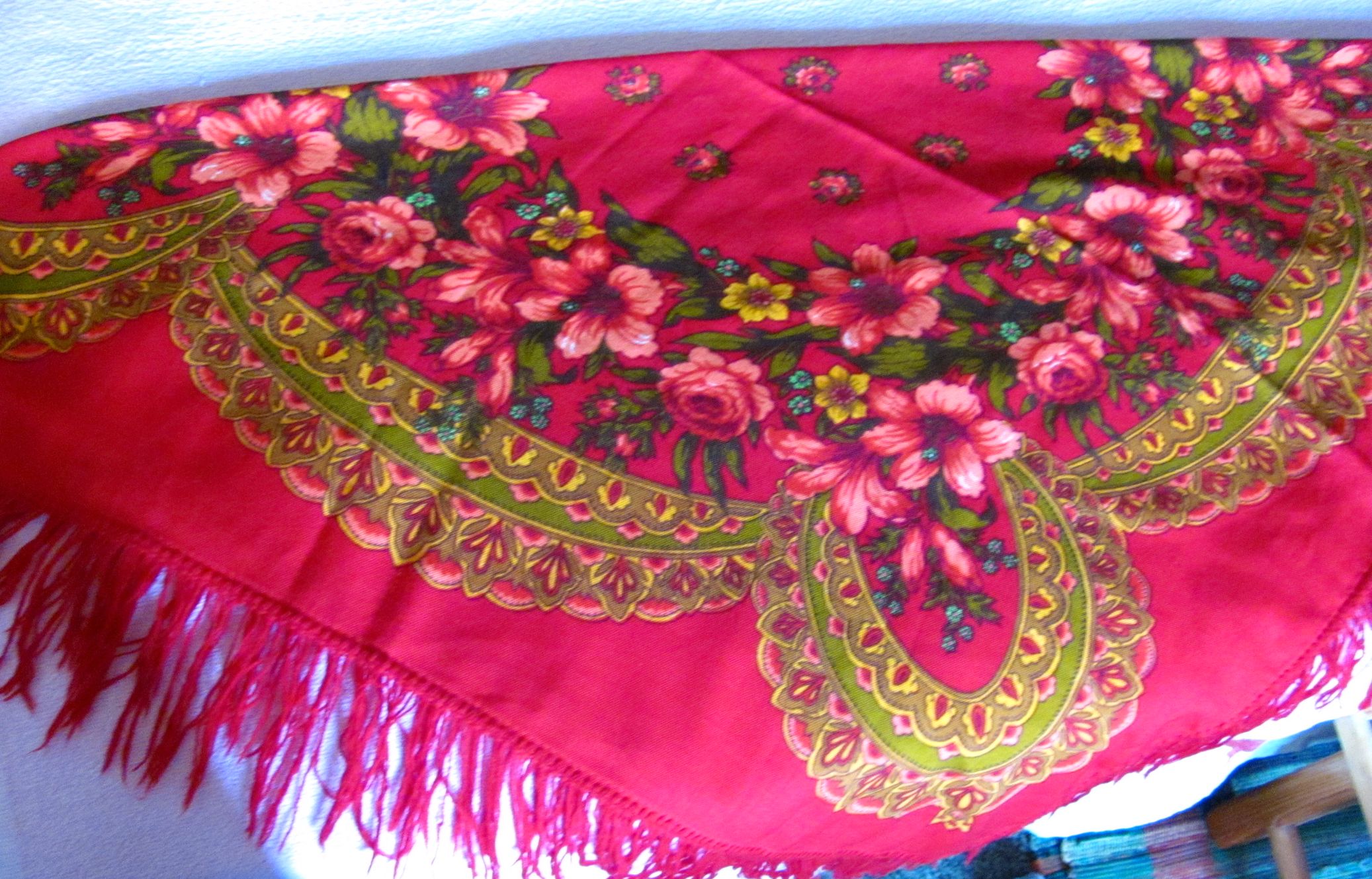 Девушки, а может кто знает как зовут мой платочек? Размер у него 89*89, приобретен был еще году в 1991-м, примерно. Ношу его, ношу, и только недавно в голову пришло узнать название))) Вот! Фото сдела в домашних условиях при естественном освещении (но, видимо, слабоватом, т.к. реально фон теплого темно-красного цвета, цветы ярко-розовые, холодные, аж ядовитые, а орнаментальная полоса рыже-коричневая)