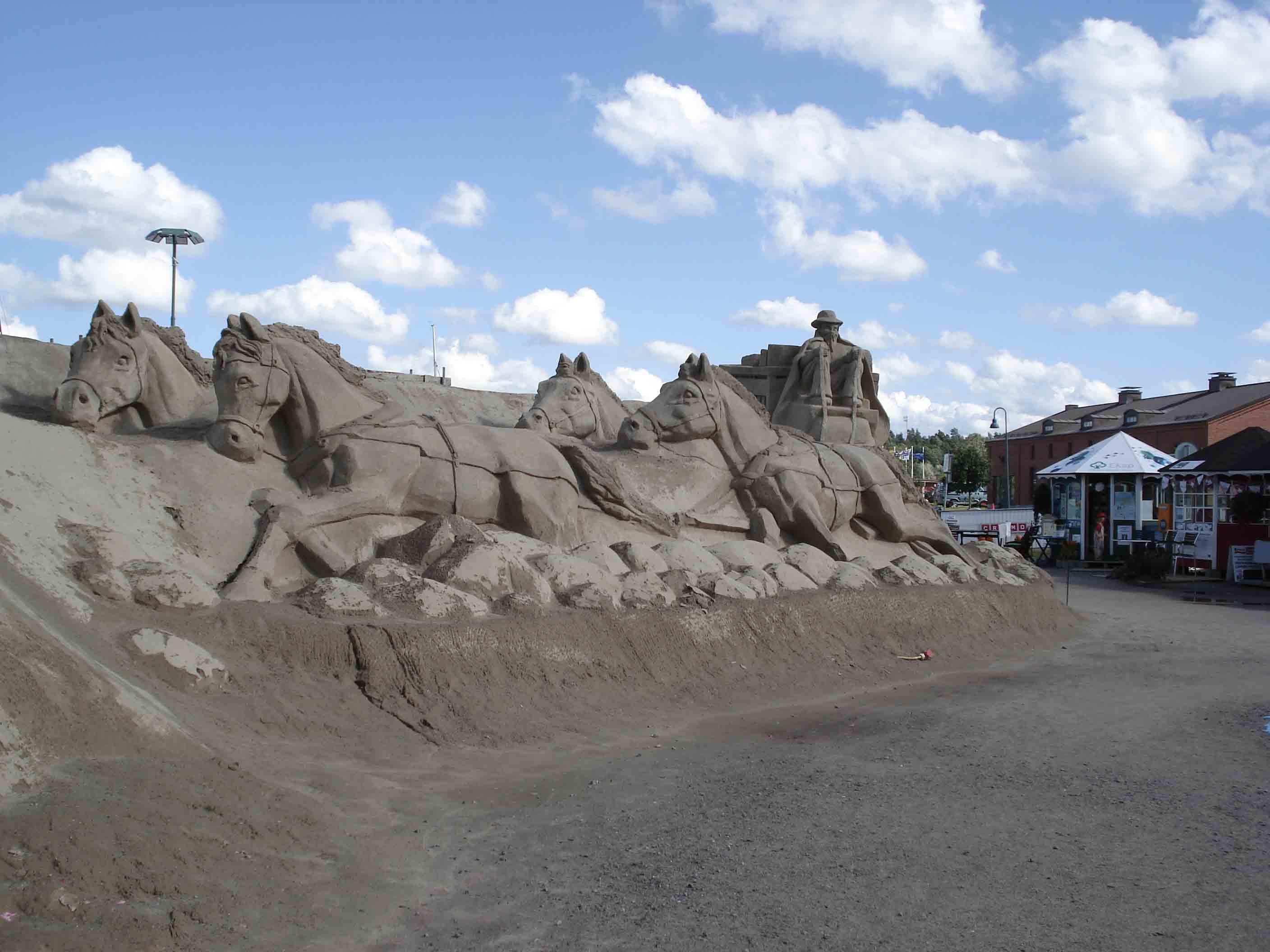 Вот и Сайменское озеро показалось! С горочки вниз... А там тоже нас интересное ждет... Пристань, корабли и яхты и...ежегодный фестиваль песчаных скульптур, даже целого города! Уверяю, такого вы не видели, если, конечно, не были в Лаппеенранте! На строительство такого города уходит более трех тонн песка! Но это уже не сегодня... Караул устал, в крепости тоже наступает ночь