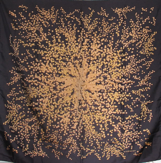 Выложу сюда свой черный с мимозой. Размер, наверное, 90х90 или типа того, саржа.