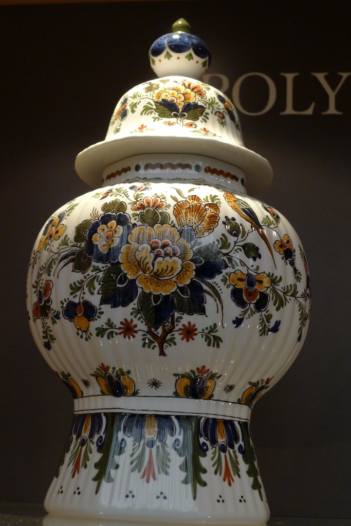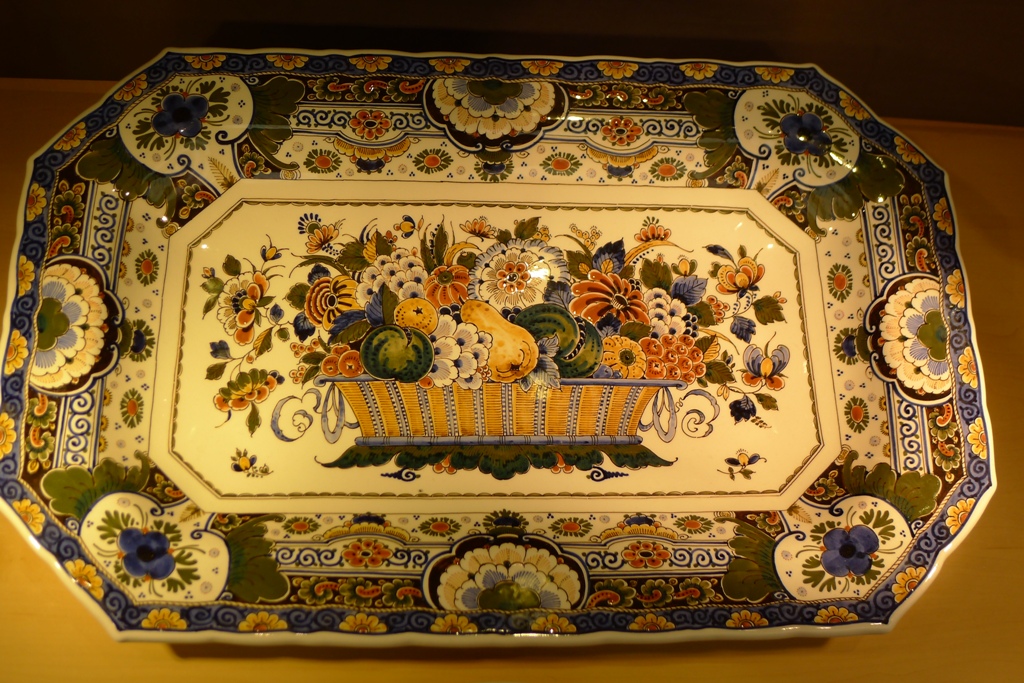 Наверное, поэтому в Royal Delft было создано дочернее производство – фабрика «Вестравен», где изделия не расписываются вручную, а украшаются декором, нанесенным с помощью трансферной техники – декор сначала вымачивается в воде, затем наносится на уже покрытый глазурью и обожженный 2 раза продукт. Этот продукт обжигается еще один раз, и декор сплавляется с глазурным слоем. Цена этих изделий на порядки ниже, чем фарфора «Porceleyne Fles». Маркируются они тоже по-другому и выглядят иначе. В фирменном магазине продукция «Вестравен» занимает несколько витрин у входа (на последнем фото).