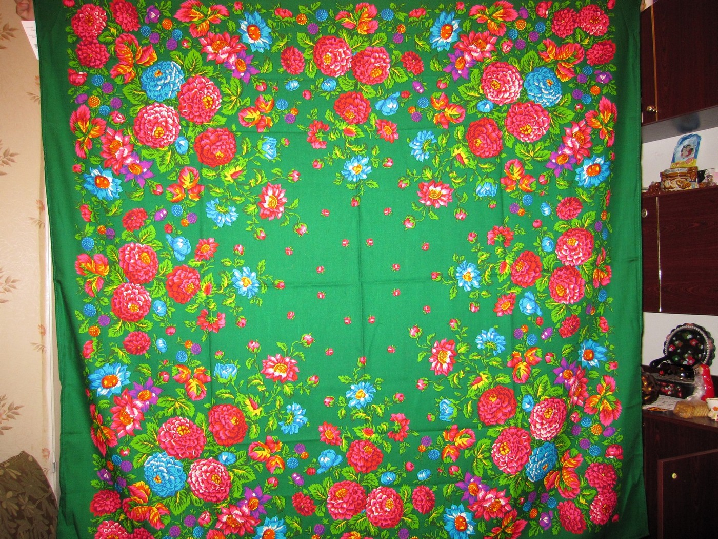 Свадебные ленты - очень красивый платок. Синяя кайма более блестящая, чем основа в Розах и пионах. Сравнение сделала, теперь перемещусь в "Сравнение колоритов", там фото размещу.