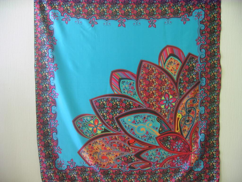 Вот такую шаль купила в рядах на Вернисаже в Измайлове. 140х140, мягкий крепдешин. Совсем не скользкий, с плеч плат не убегает.