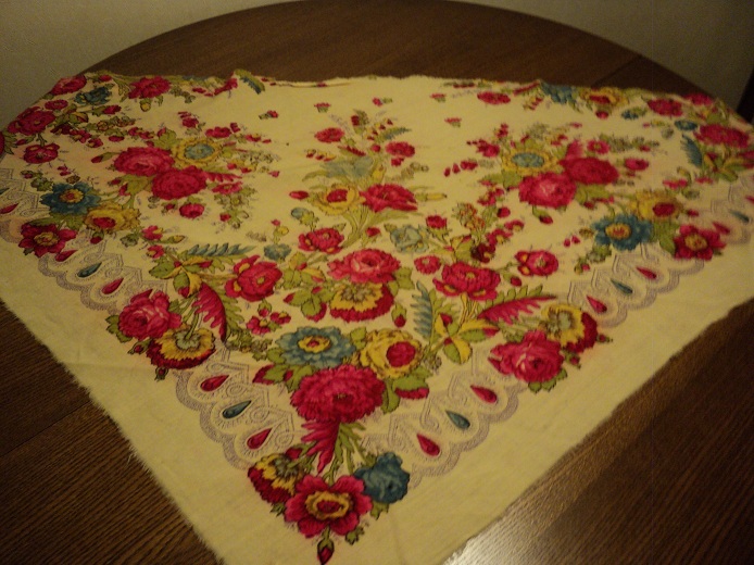 Тётя передала мне старые платки моей прабабушки и ее приятельницы-соседки. Белопольный (стал почти желтым) был разрезан когда-то на две косынки, сохранилась одна и то в плохом состоянии. Размер стороны -107 см. Эту косынку я помню с детства, меня ею утепляли на прогулке в морозы и во время болезни. Платок казался тогда мне божественно красивым. Вот они знаменитые родаминовые розы (Кликните, чтобы почитать, что спрятано под катом)...! Тетя считает, что платок дореволюционный. Сравнивала характер рисунка с иллюстрациями альбома Толстухиной и Полосиновой "Павловопосадские платки". Прием окрашивания кончиков листьев контрастной краской я обнаружила на шали 1889 г. и на платках 30-х годов. Мне все-таки кажется, что платок произведен в 30-е или 40-е годы. Однозначно, что это ручная набойка. Итак, фотографии. Предупреждаю, что на платке дырочки,пятна, расплывшаяся краска, почти смылся черный контур рисунка...