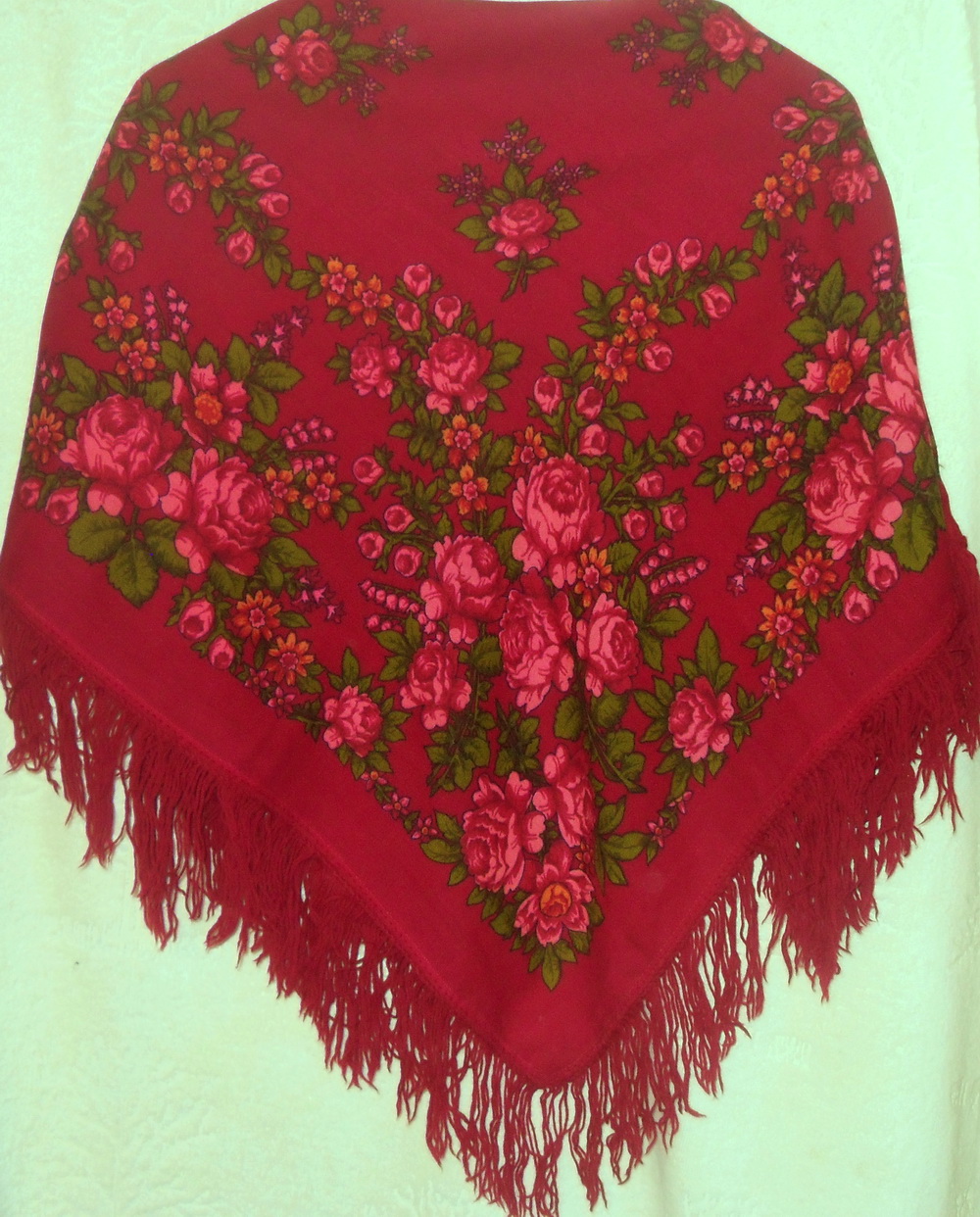 Нашла еще фотографии этого платка, но хозяйка тоже не знает его происхождения, у нее он с 80-х годов. Я не исключаю, что это сделано в Павловском Посаде, но смущают два момента. Во-первых, обработка края: обшивать маленькие шерстяные платки оверлоком в ПП стали лишь относительно недавно (в конце 1990-х годов еще не оверлочили). Во-вторых, нехарактерный набор красок (для Павловского Посада в тот период). Но, конечно, могу и ошибаться.