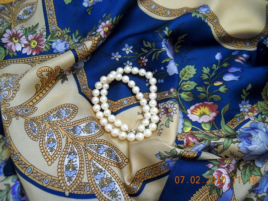 Жемчуг и шелк - превосходное сочетание! Жемчужные бусы со многими другими платочками тоже будут хороши - и с крепдешиновыми, и с атласными: главное, чтобы рисунок по стилю подходил.