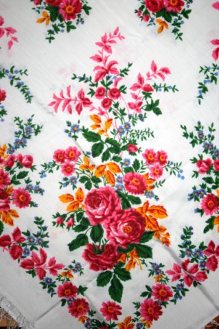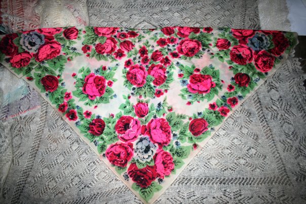 Практически наверняка павловопосадские - шаль, белый шерстяной и хлопчатобумажный платки. У шали чудесный рисунок - люблю такие живые цветы. Отдельное спасибо - за крупную ее фотографию ^% ^% ^% : вся красота видна.