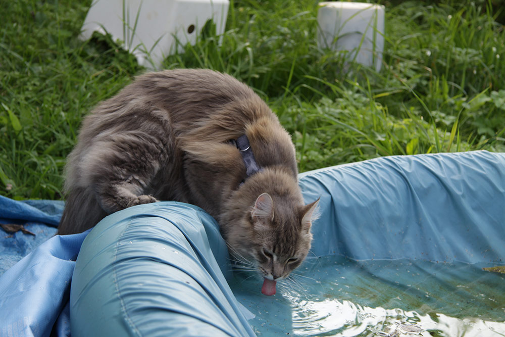 Кот дело заразительное, покажу и я своего. Спускали бассейн, без кота конечно никак, полез проверять ну и водички похлебать.